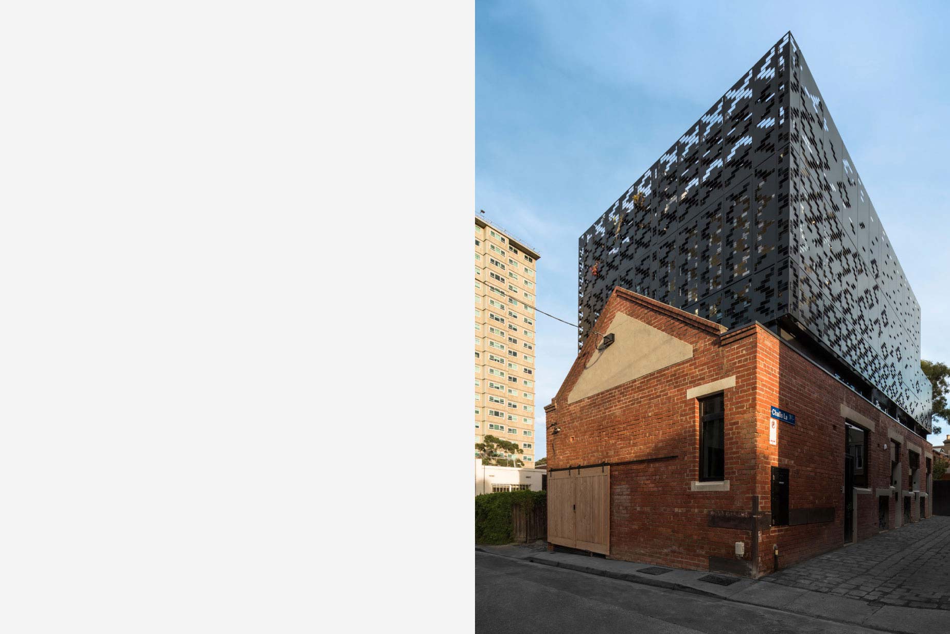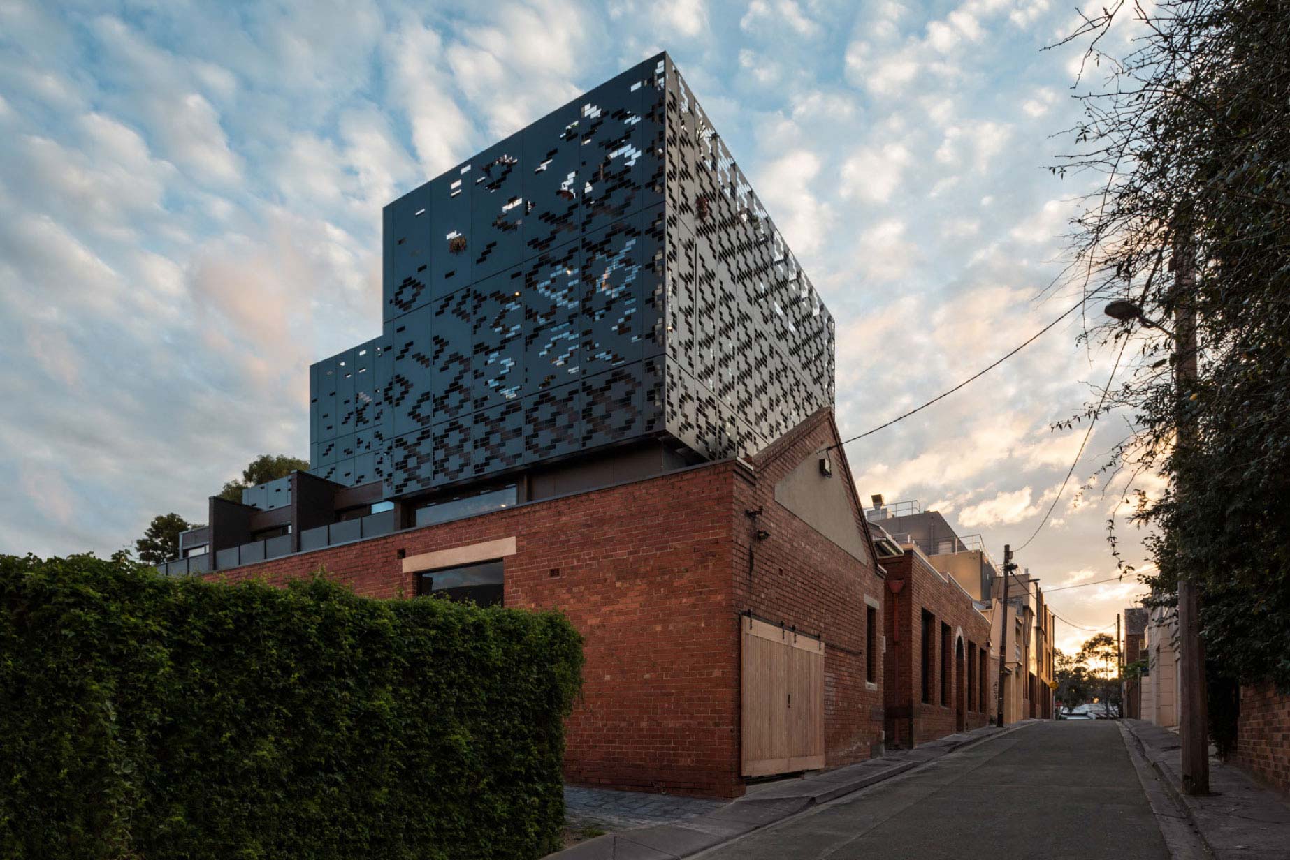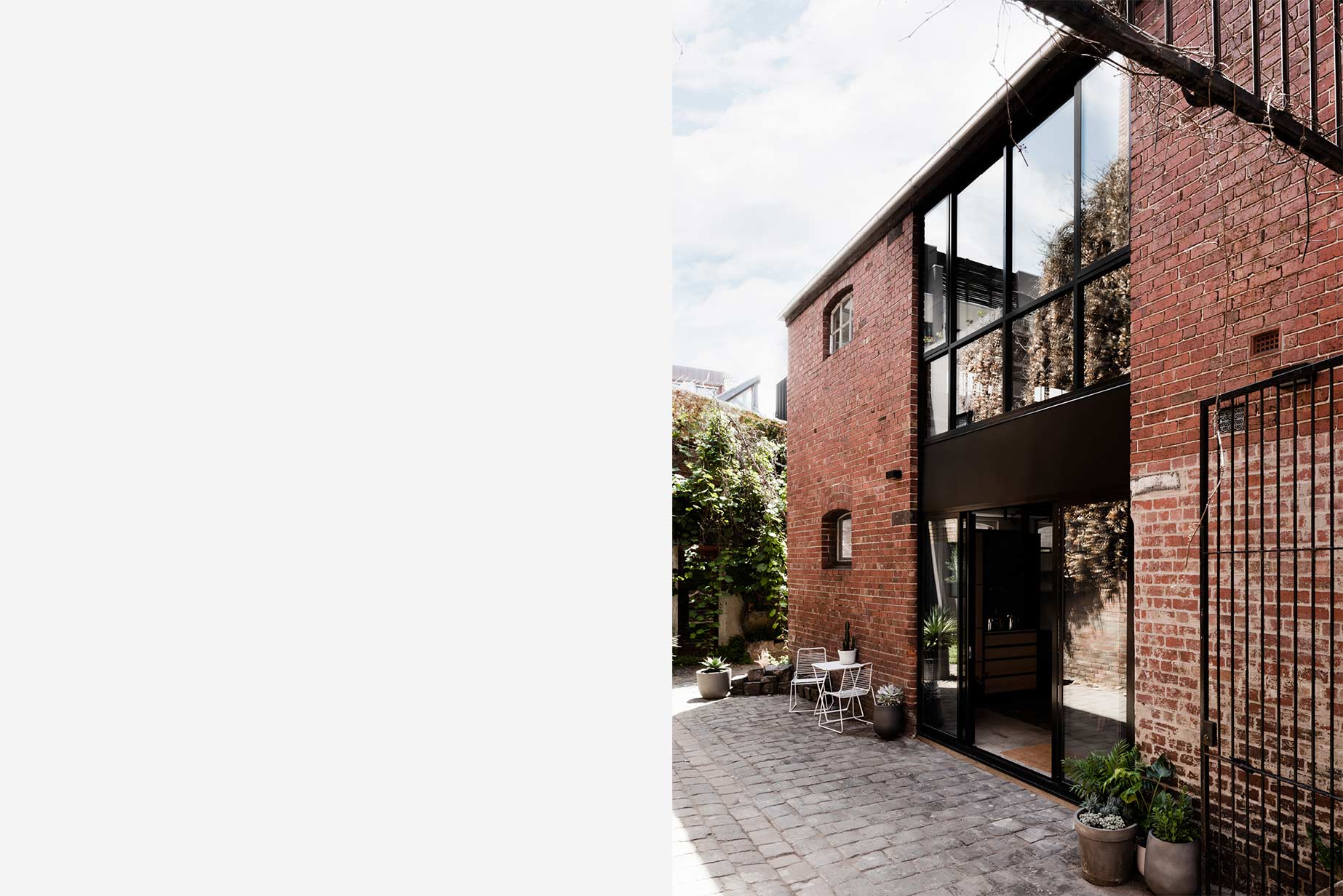 Designed by DKO for Milieu Property and completed in June 2016. The project involved five two-bedroom townhouses designed to give the impression of a contemporary dwelling growing within, and extending beyond, the integrated heritage redbrick façade. Expansive glass panes and a powder coated operable screen contrast against the aged structure at ground level.